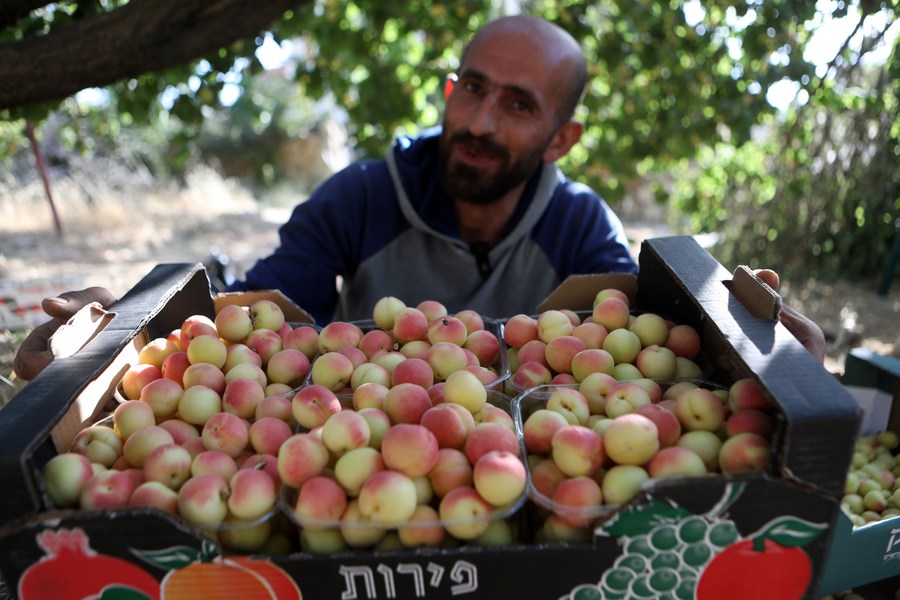 A Palestinian man displays apricots during the harvest season at a farm in al-Shuyoukh village, east of the West Bank city of Hebron, on June 12, 2022. (Photo by Mamoun Wazwaz/Xinhua)