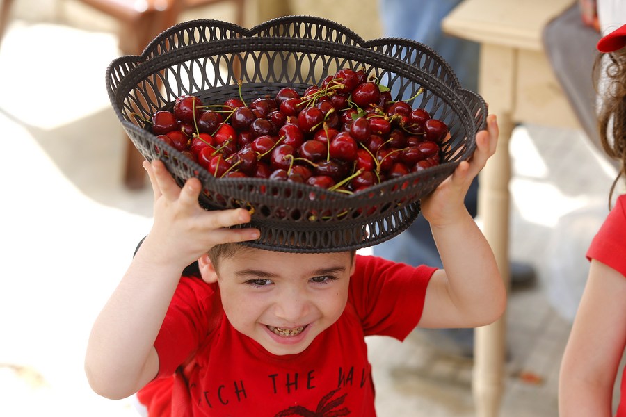 A boy carries a basket with cherries at the Hammana Cherry Festival in the village of Hammana, Mount Lebanon Governorate, Lebanon, on June 12, 2022. (Xinhua/Bilal Jawich)