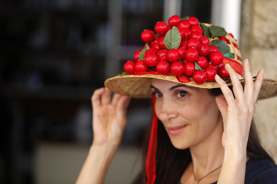 A woman shows a cherry hat at the Hammana Cherry Festival in the village of Hammana, Mount Lebanon Governorate, Lebanon, on June 12, 2022. (Xinhua/Bilal Jawich)