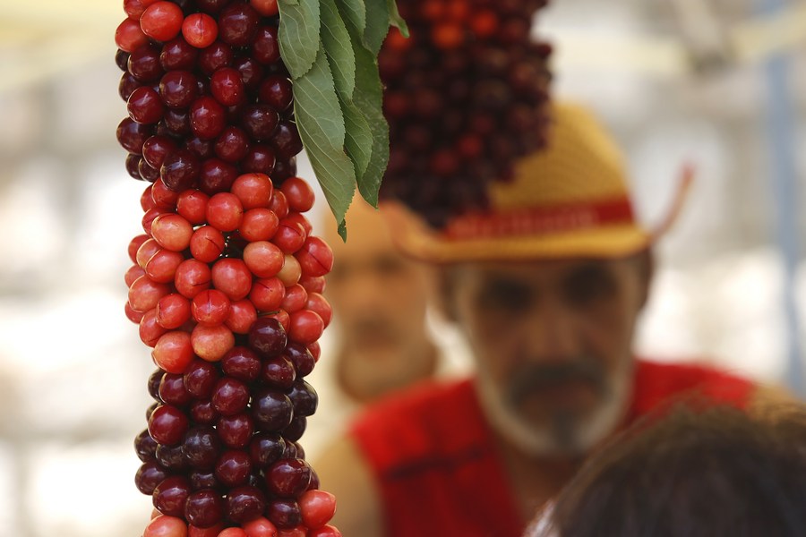 Cherries are displayed at the Hammana Cherry Festival in the village of Hammana, Mount Lebanon Governorate, Lebanon, on June 12, 2022. (Xinhua/Bilal Jawich)