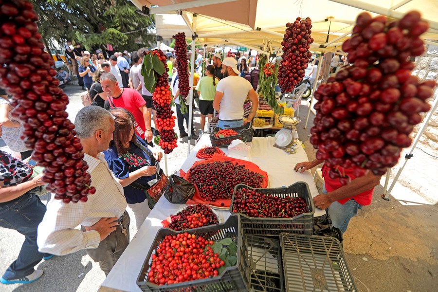People visit the Hammana Cherry Festival in the village of Hammana, Mount Lebanon Governorate, Lebanon, on June 12, 2022. (Xinhua/Bilal Jawich)