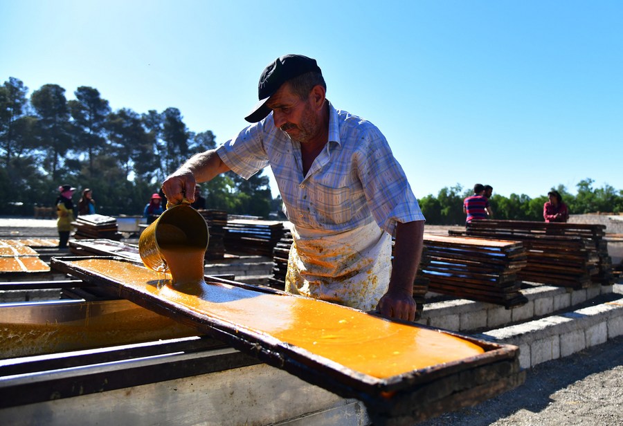A farmer airs apricot juice to make apricot paste, a famous product in Syria, at a farm in Damascus, Syria, June 11, 2022. (Photo by Ammar Safarjalani/Xinhua)■
