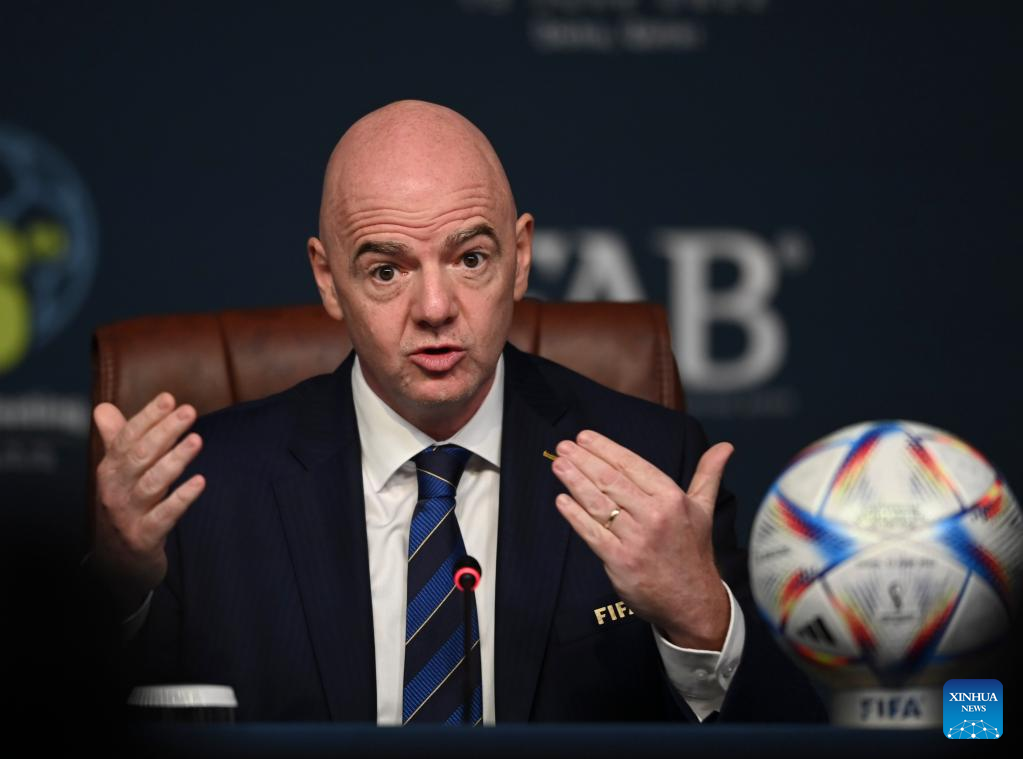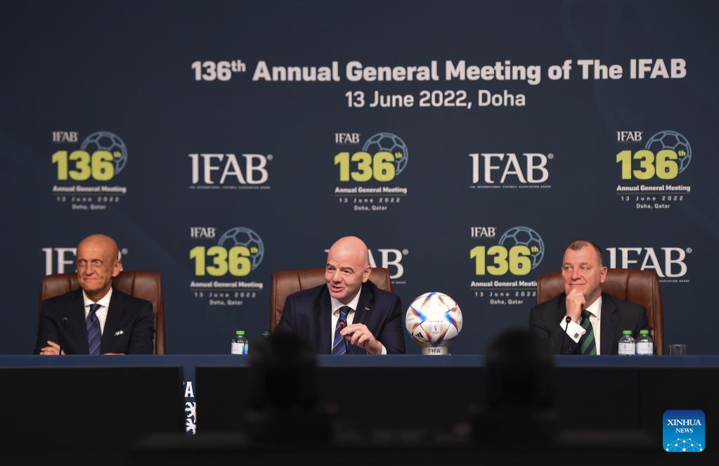 FIFA President Gianni Infantino speaks during a press conference for the 136th annual general meeting of the International Football Association Board (IFAB) in Doha, capital of Qatar, June 13, 2022. (Photo by Nikku/Xinhua)