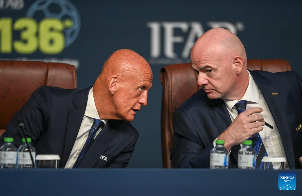 FIFA President Gianni Infantino (C) and FIFA Referees Committee Chairman Pierluigi Collina (L) attend a press conference for the 136th annual general meeting of the International Football Association Board (IFAB) in Doha, capital of Qatar, June 13, 2022. (Photo by Nikku/Xinhua)