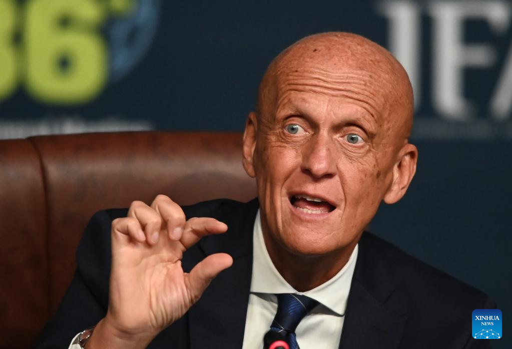 FIFA Referees Committee Chairman Pierluigi Collina speaks during a press conference for the 136th annual general meeting of the International Football Association Board (IFAB) in Doha, capital of Qatar, June 13, 2022. (Photo by Nikku/Xinhua)