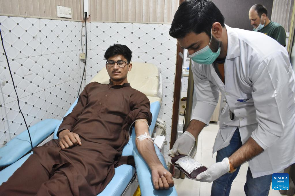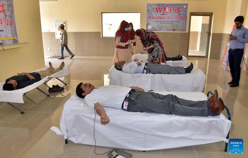 People donate blood at a blood center on World Blood Donor Day in Lahore, Pakistan, on June 14, 2022. World Blood Donor Day is marked on June 14 each year. (Photo by Sajjad/Xinhua)