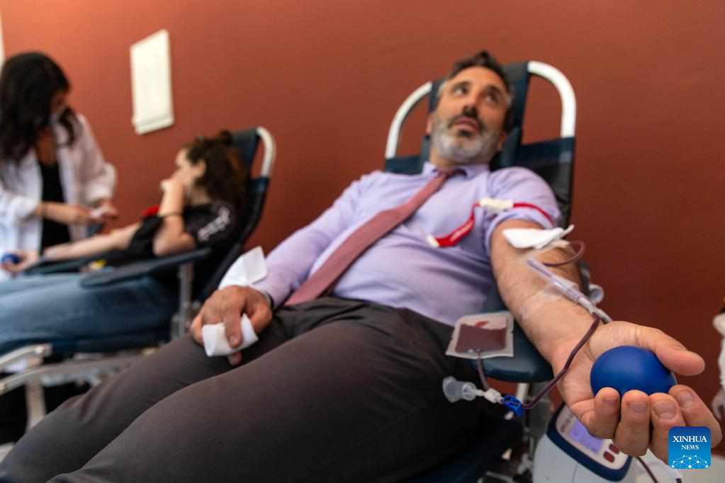 A staff member of the Presidential Mansion of Hellenic Republic donates blood to mark World Blood Donor Day in Athens, Greece, on June 14, 2022. World Blood Donor Day is marked on June 14 each year. (Xinhua/Marios Lolos)