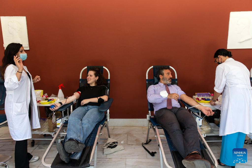 Staff members of the Presidential Mansion of Hellenic Republic donate blood to mark World Blood Donor Day in Athens, Greece, on June 14, 2022. World Blood Donor Day is marked on June 14 each year. (Xinhua/Marios Lolos)