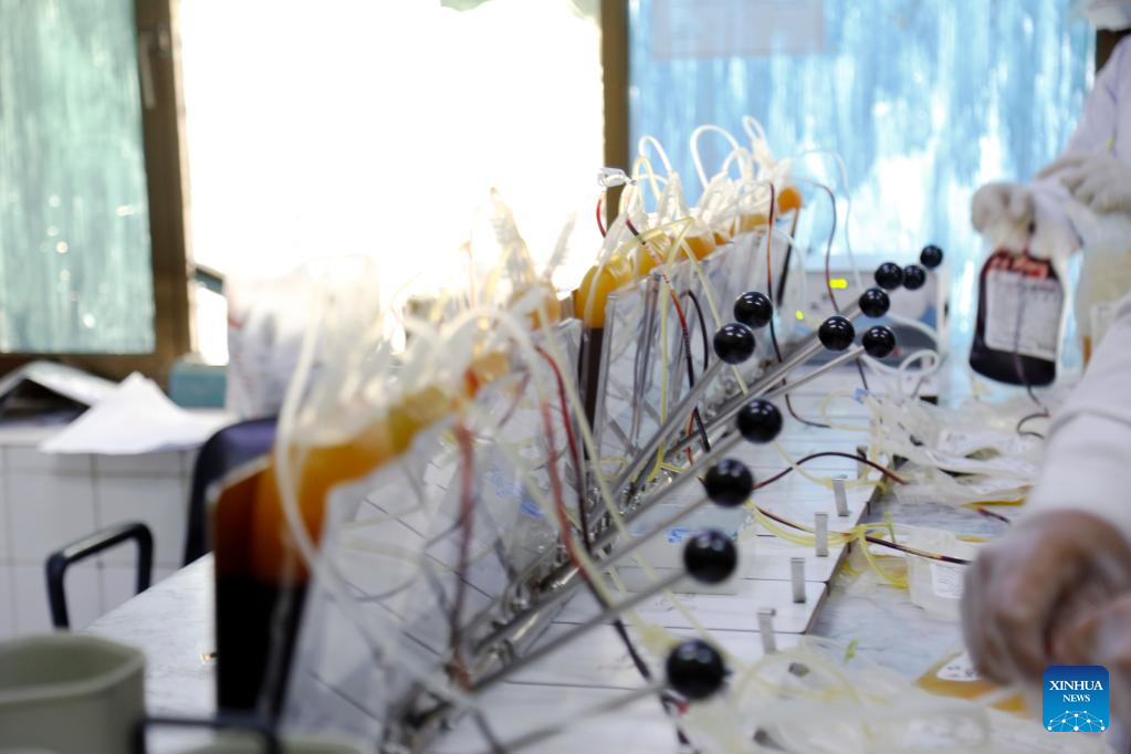Medical members prepare blood bags at the National Center for Blood Transfusion and Research in Sanaa, Yemen, on June 14, 2022. Hundreds of residents in Sanaa heeded the call from the local medical authorities and came to the blood transfusion center to donate blood on Tuesday, which marks World Blood Donor Day. (Photo by Mohammed Mohammed/Xinhua)