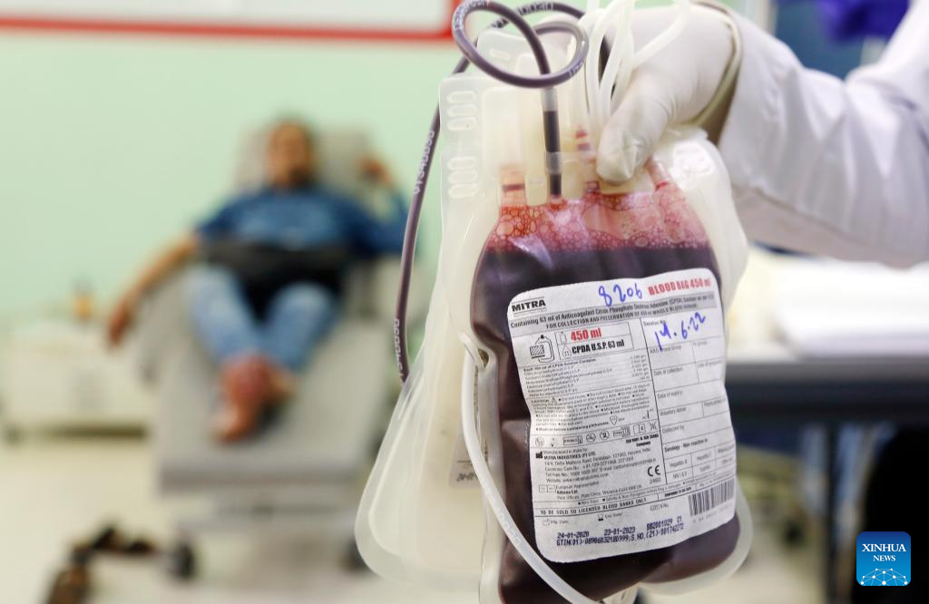 A medical staff member holds a bag of blood donated by volunteers at the National Center for Blood Transfusion and Research, in Sanaa, Yemen, on June 14, 2022. Hundreds of residents in Sanaa heeded the call from the local medical authorities and came to the blood transfusion center to donate blood on Tuesday, which marks World Blood Donor Day. (Photo by Mohammed Mohammed/Xinhua)