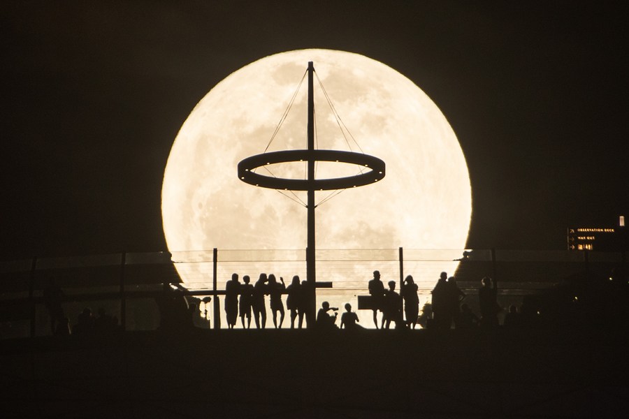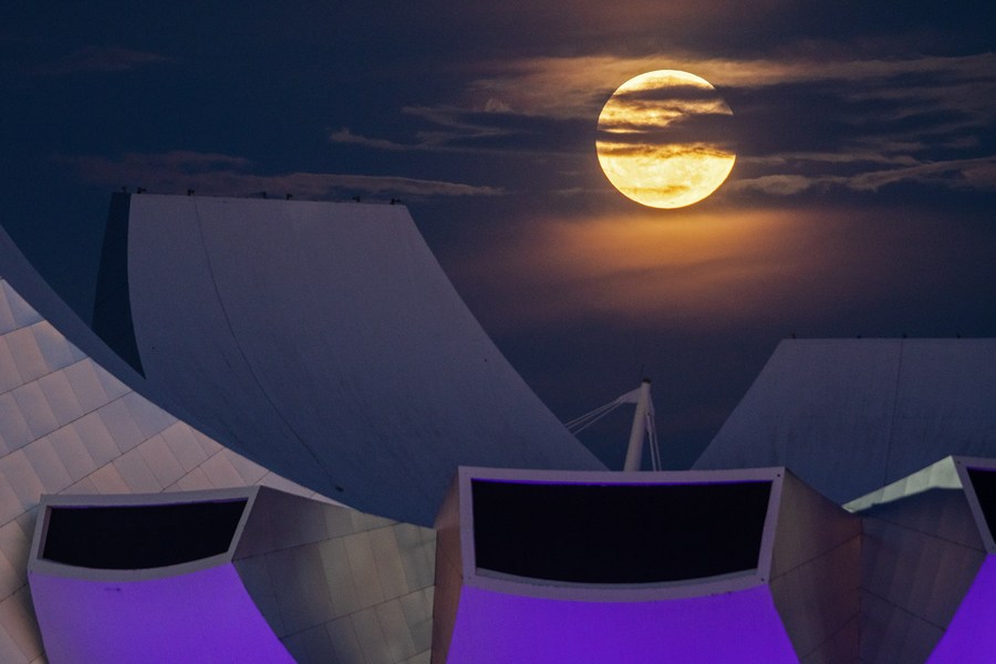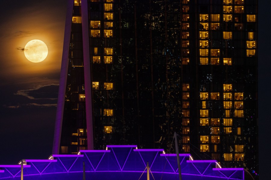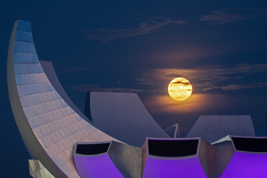 A supermoon is seen in the sky above Singapore's Marina Bay on June 14, 2022. (Photo by Then Chih Wey/Xinhua)