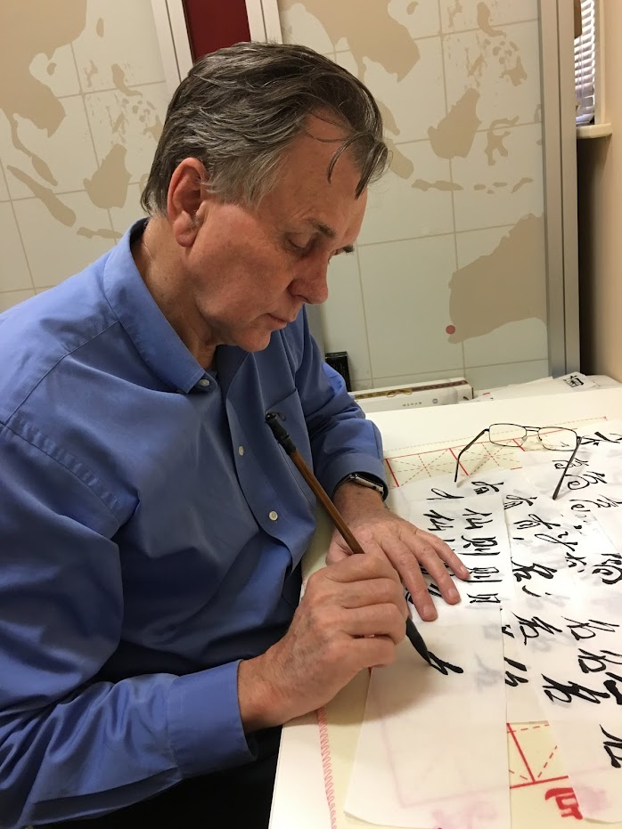 Photo provided by the Marshall Center at the University of Western Australia (UWA) shows Professor Barry Marshall practicing Chinese calligraphy at the UWA on Nov. 25, 2016. (Marshall Center at the University of Western Australia/Handout via Xinhua)
