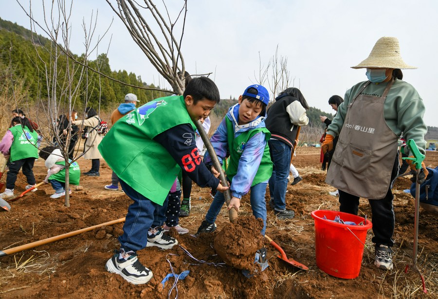 Children take part in a tree-planting event at the wasted Donghouziyu quarry in Jizhou District, north China's Tianjin, March 12, 2022. Children from 12 families took part in a tree-planting event with the help of their parents and staff members at the wasted Donghouziyu quarry on Saturday. (Xinhua/Sun Fanyue)