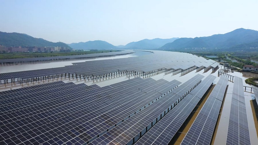 Aerial photo taken on May 30, 2022 shows China's first solar-tidal photovoltaic power plant in Wugen Township of Wenling, east China's Zhejiang Province. (Xinhua)