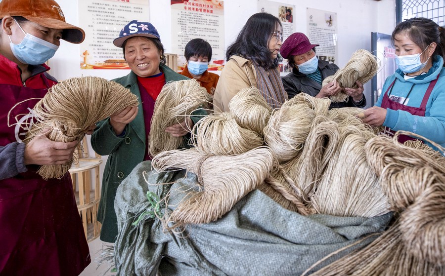 Villagers select the raw material of hemp weaving in Yueyahu Township, Yinchuan, capital of northwest China's Ningxia Hui Autonomous Region, March 4, 2022. (Xinhua/Yang Zhisen)