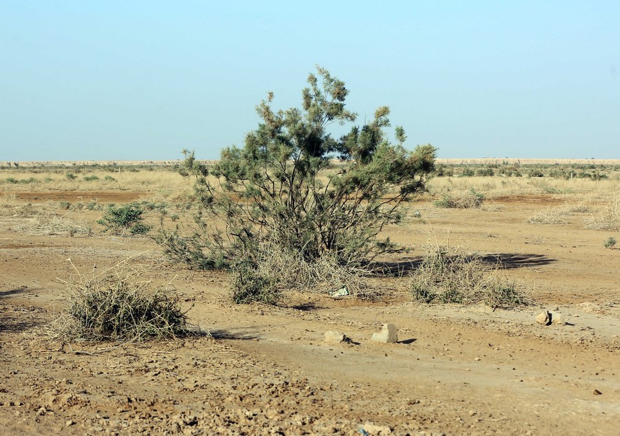 Desert plants grow on cracked land in a dry agricultural area due to water scarcity in Salahudin province, Iraq, on June 14, 2022. (Xinhua/Khalil Dawood)