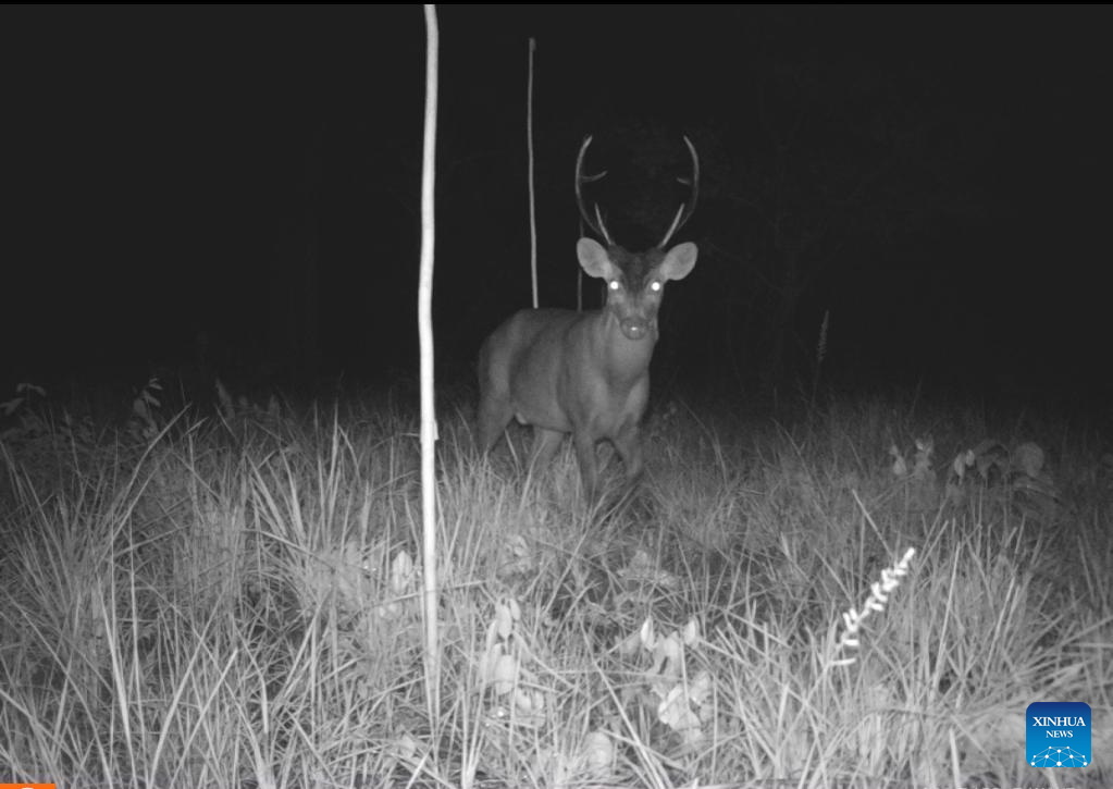 A hog deer is captured by a camera trap in the Prek Prasob Wildlife Sanctuary in Kratie, Cambodia in January 2022. Eighty-four globally endangered hog deer are roaming grassland habitats in the Prek Prasob Wildlife Sanctuary of Mekong flooded forest in northeastern Cambodia, according to the first camera-trap survey of the hog deer population released on Thursday.(MoE/WWF/Handout via Xinhua)