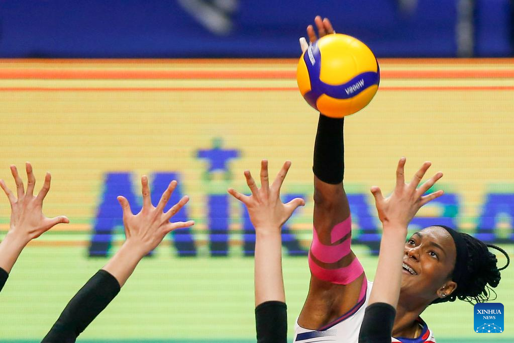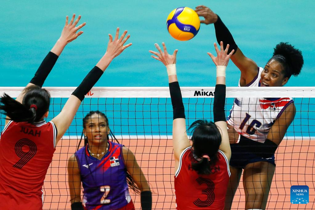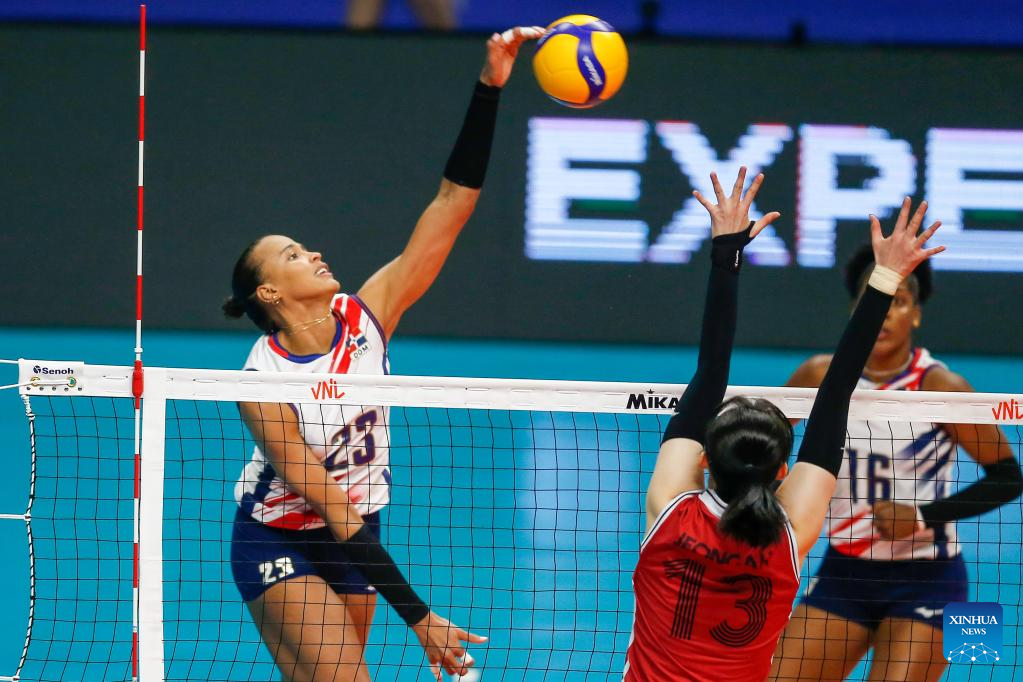 Yonkaira Paola Pena Isabel (1st R) of Dominican Republic spikes the ball during the FIVB Volleyball Nations League Women Pool 3 match between Dominican Republic and South Korea in Brasilia, Brazil, on June 15, 2022. (Photo by Lucio Tavora/Xinhua)