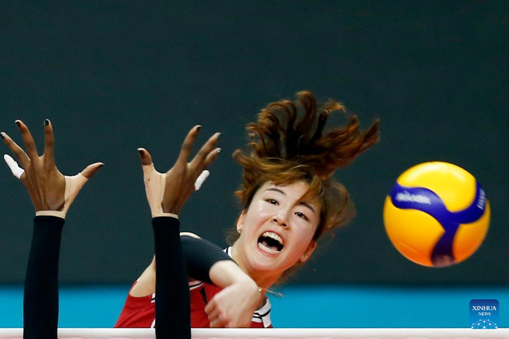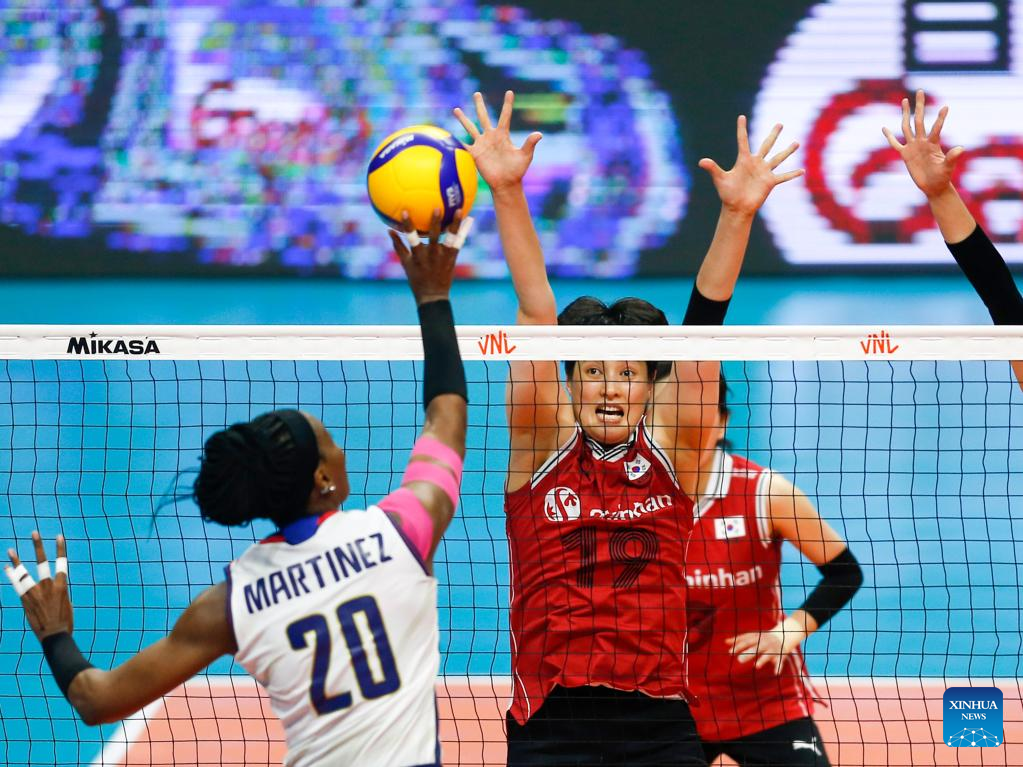 Jung Hoyoung of South Korea spikes the ball during the FIVB Volleyball Nations League Women Pool 3 match between Dominican Republic and South Korea in Brasilia, Brazil, on June 15, 2022. (Photo by Lucio Tavora/Xinhua)