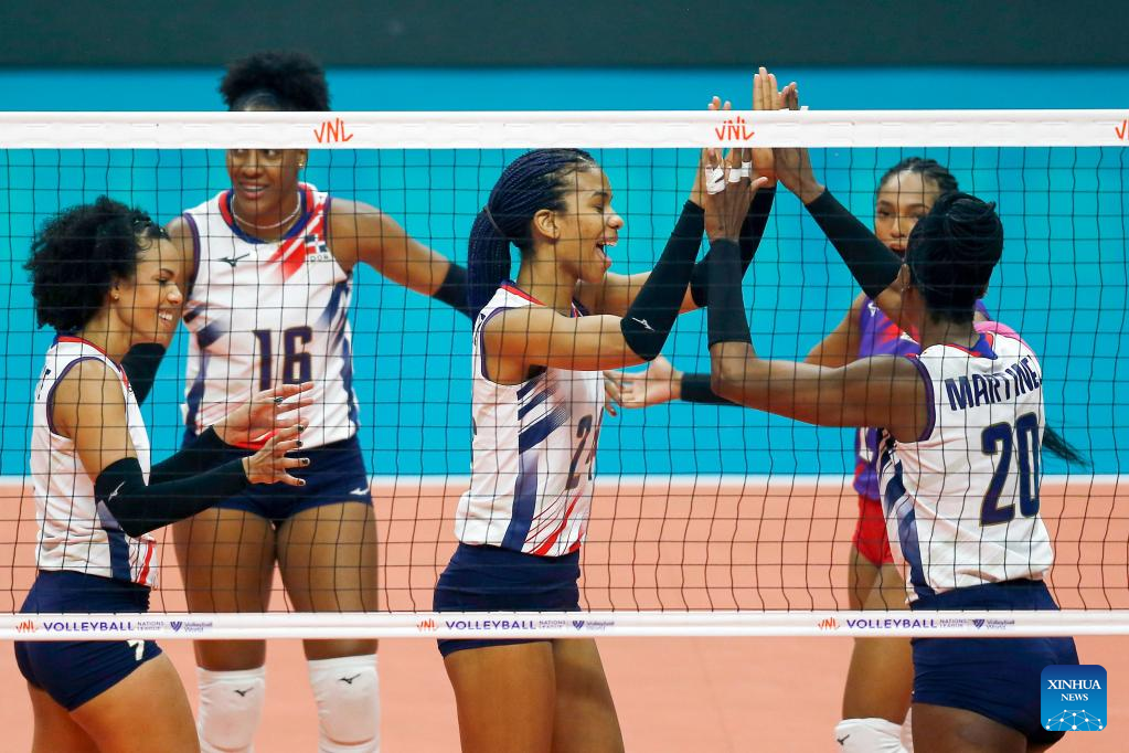 Players of Dominican Republic celebrates scoring during the FIVB Volleyball Nations League Women Pool 3 match between Dominican Republic and South Korea in Brasilia, Brazil, on June 15, 2022. (Photo by Lucio Tavora/Xinhua)