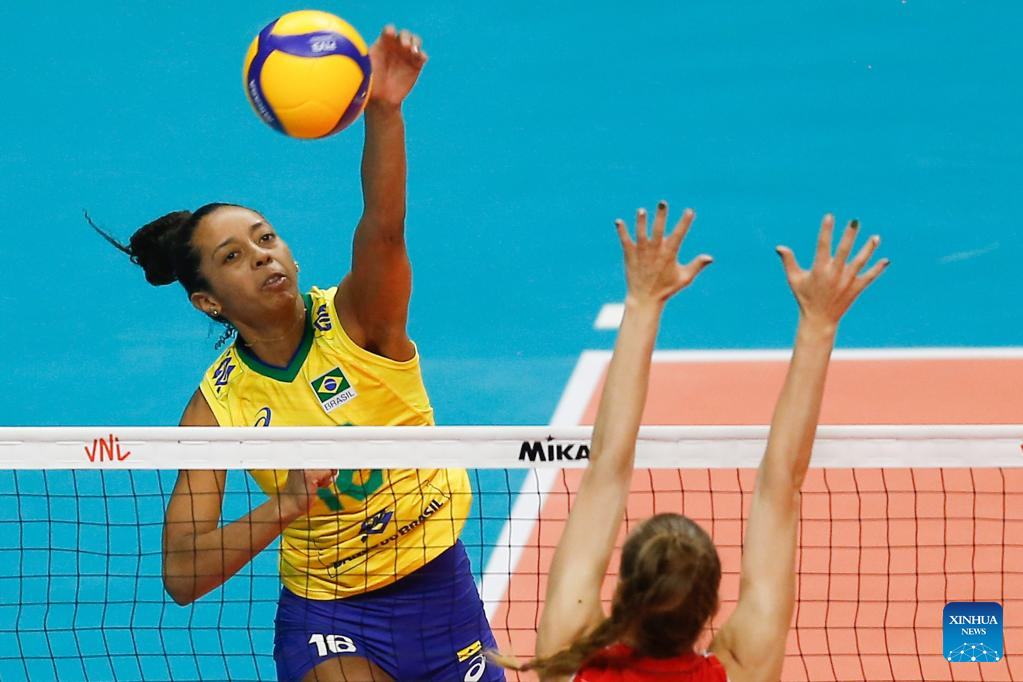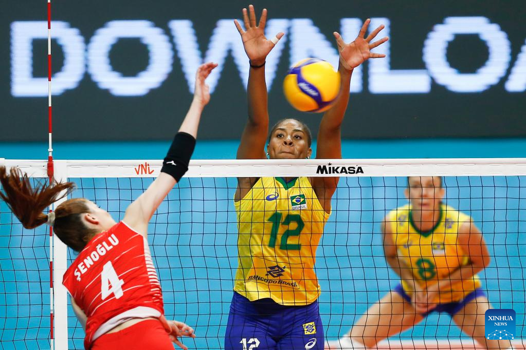 Kisy (L) of Brazil spikes the ball during the FIVB Volleyball Nations League Women Pool 3 match between Brazil and Turkey in Brasilia, Brazil, on June 15, 2022. (Photo by Lucio Tavora/Xinhua)