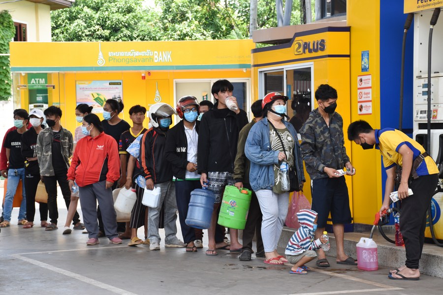 Citizens queue up for fuel at a petrol station in Vientiane, Laos on May 14, 2022. (Photo by Kaikeo Saiyasane/Xinhua)