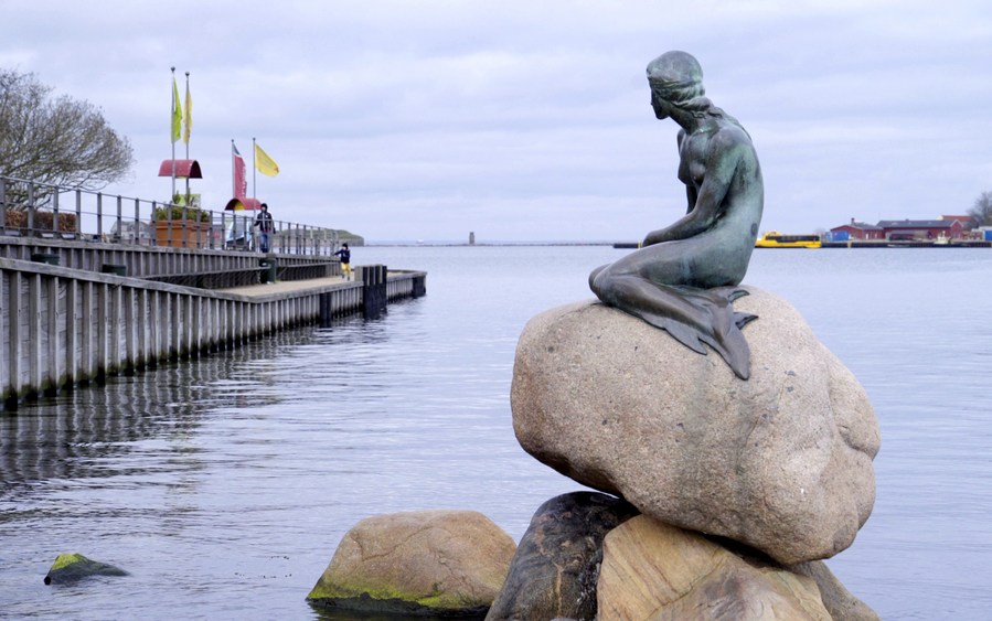 People walk past the Little Mermaid statue in Copenhagen, Denmark, March 17, 2020. (Photo by Anders Kongshaug/Xinhua)