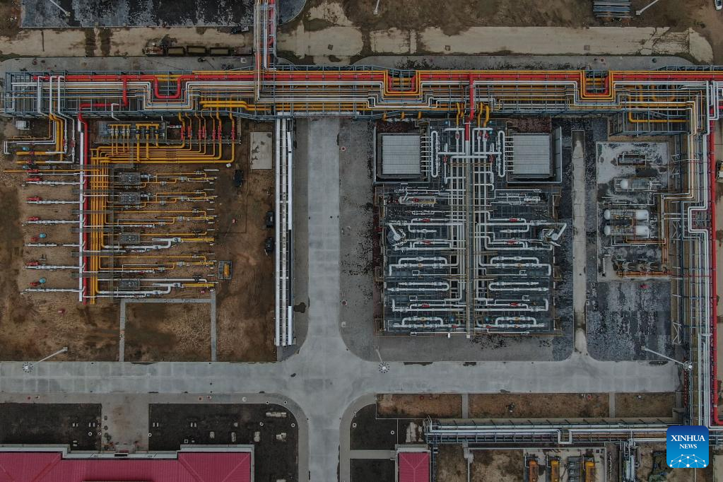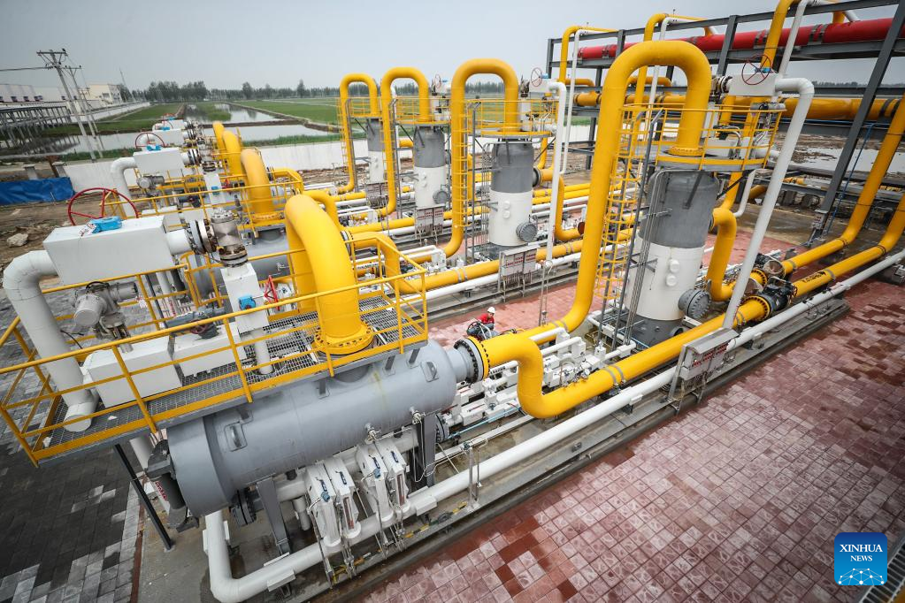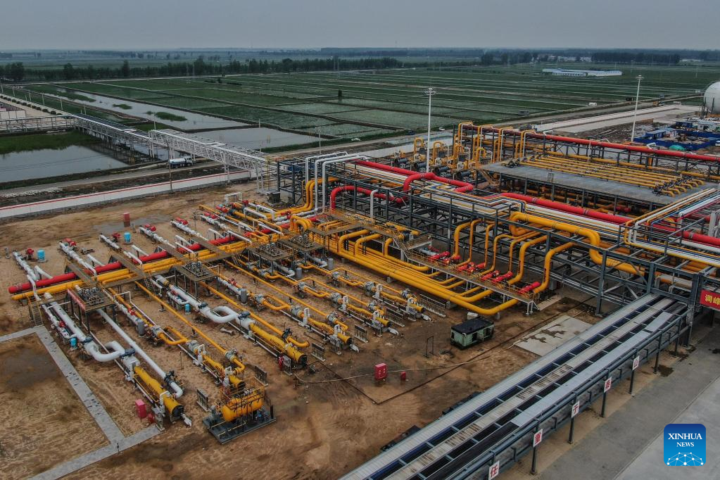 Aerial photo taken on June 15, 2022 shows the PetroChina Liaohe Oilfield gas storage group in Panjin, northeast China's Liaoning Province. The homebred gas injection system was successfully put into operation here in late May, and the overall daily gas injection capacity of Liaohe gas storage group increased from 14 million cubic meters to 30 million cubic meters. (Xinhua/Pan Yulong)