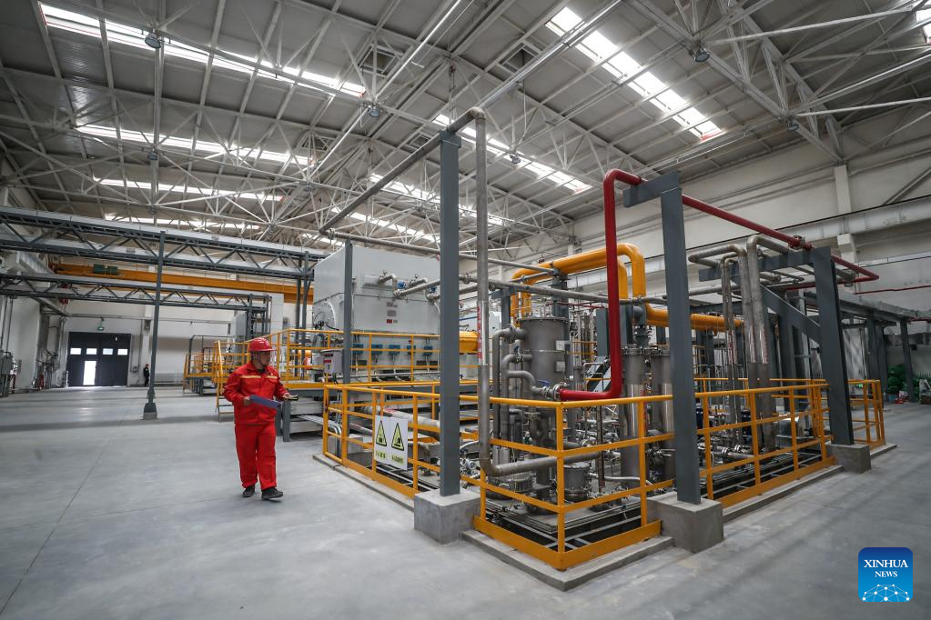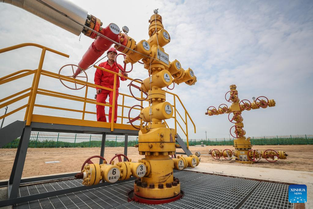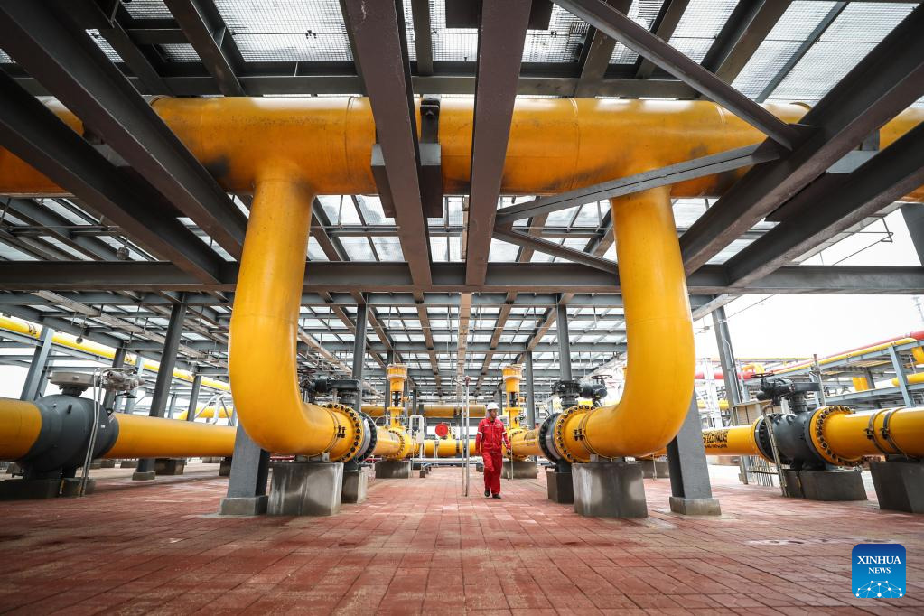 A staff member inspects at the Shuangtaizi gas storage area of PetroChina Liaohe Oilfield gas storage group in Panjin, northeast China's Liaoning Province, June 15, 2022. The homebred gas injection system was successfully put into operation here in late May, and the overall daily gas injection capacity of Liaohe gas storage group increased from 14 million cubic meters to 30 million cubic meters. (Xinhua/Pan Yulong)