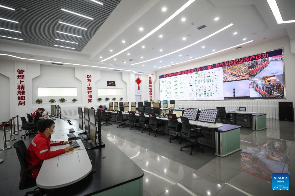 Staff member work at the central control room of Shuangtaizi gas storage area of PetroChina Liaohe Oilfield gas storage group in Panjin, northeast China's Liaoning Province, June 15, 2022. The homebred gas injection system was successfully put into operation here in late May, and the overall daily gas injection capacity of Liaohe gas storage group increased from 14 million cubic meters to 30 million cubic meters. (Xinhua/Pan Yulong)