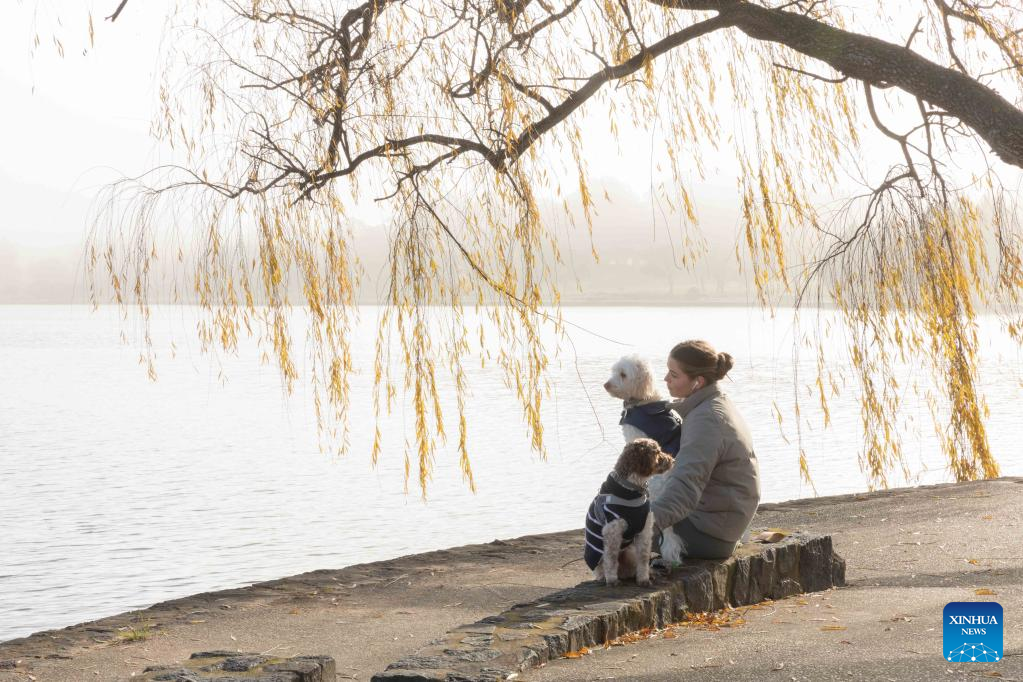Photo taken on June 17, 2022 shows a woman with her dogs sitting by the Lake Burley Griffin in the thick fog in Canberra, Australia. (Photo by Chu Chen/Xinhua)