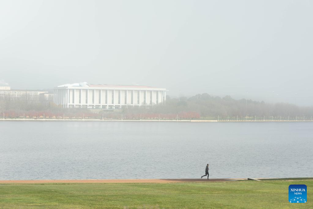 A man does morning exercise along the Lake Burley Griffin in the thick fog in Canberra, Australia on June 17, 2022. (Photo by Chu Chen/Xinhua)