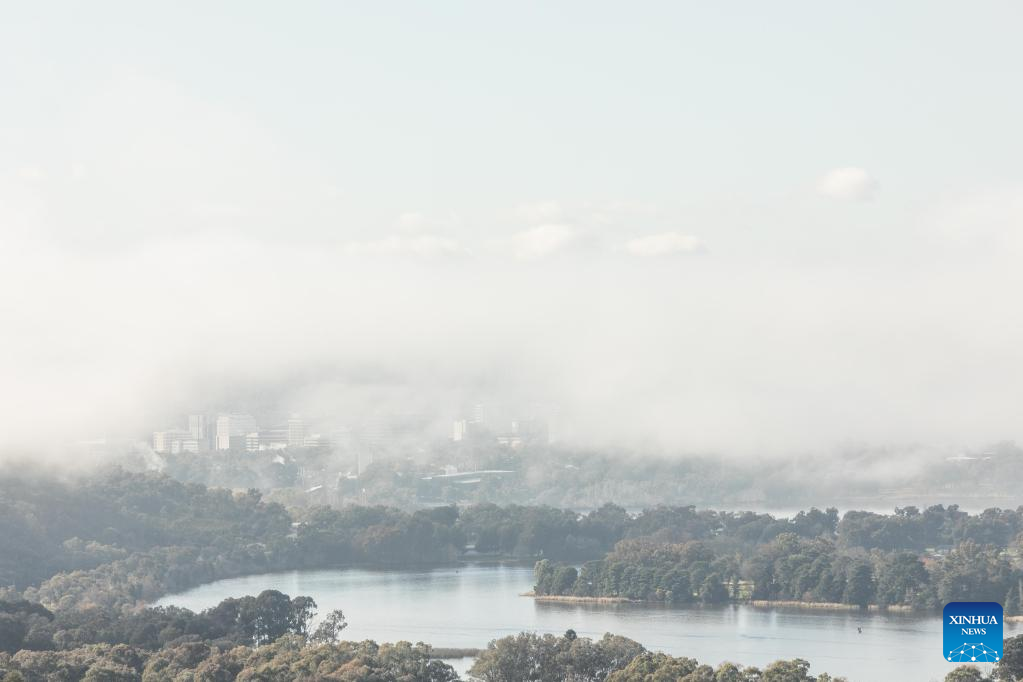 Photo taken on June 17, 2022 shows the city in the thick fog in Canberra, Australia. (Photo by Chu Chen/Xinhua)