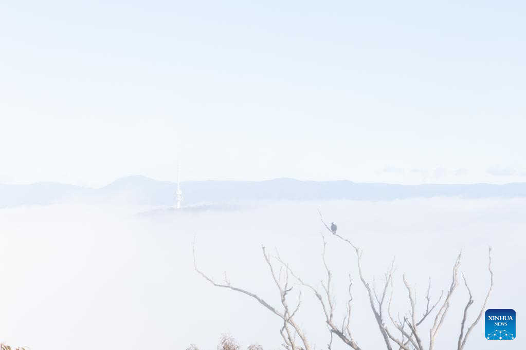 Photo taken on June 17, 2022 shows the Telstra Tower above Black Mountain in the thick fog in Canberra, Australia. (Photo by Chu Chen/Xinhua)