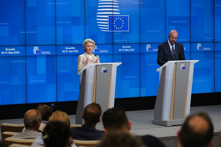 European Commission President Ursula von der Leyen (L) and President of the European Council Charles Michel address the press conference after a special meeting of the European Council in Brussels, Belgium, May 31, 2022. (Xinhua/Zheng Huansong)