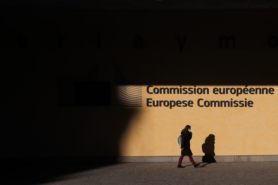 A woman walks past the European Commission building in Brussels, Belgium, on Dec. 21, 2021. (Xinhua/Zheng Huansong)■