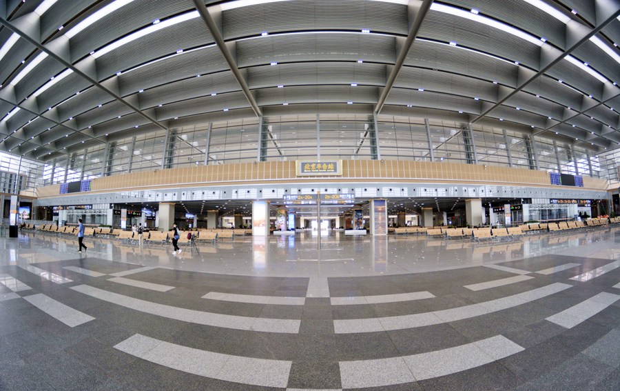Staff members work at the waiting hall to prepare for the operation of Beijing Fengtai Railway Station in Beijing, capital of China, June 16, 2022. (Xinhua/Li Xin)