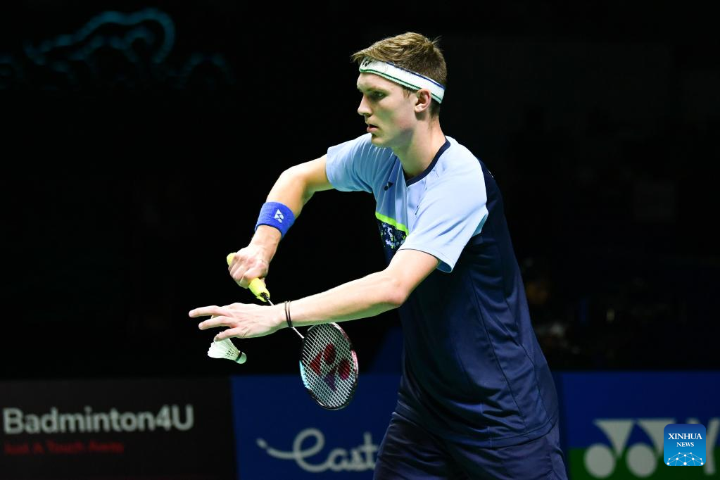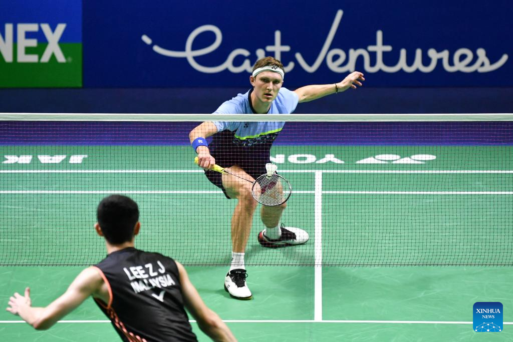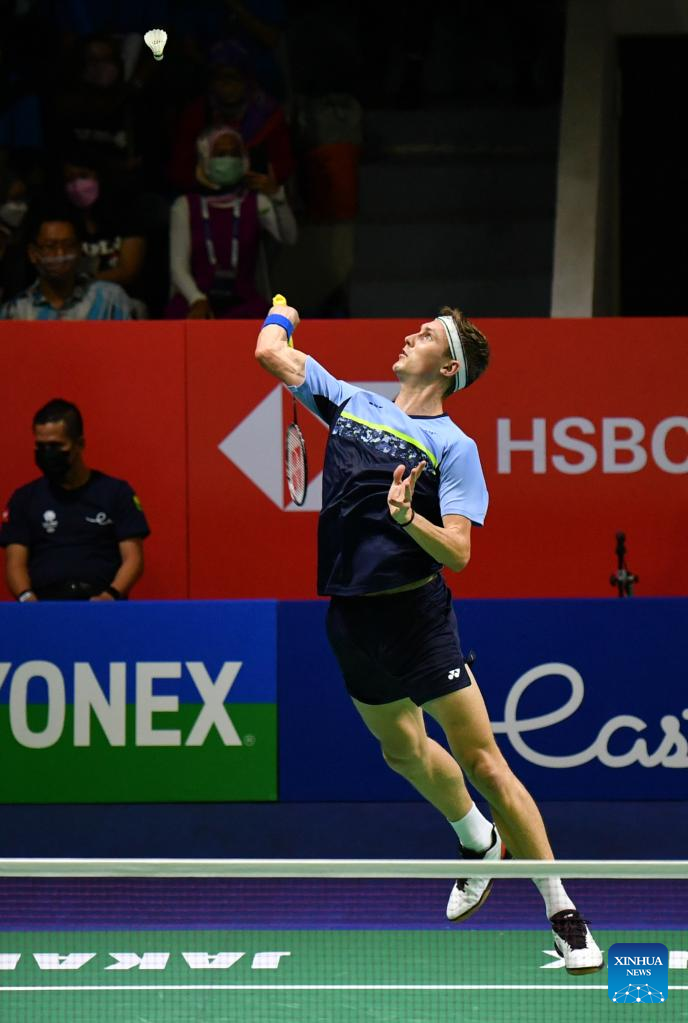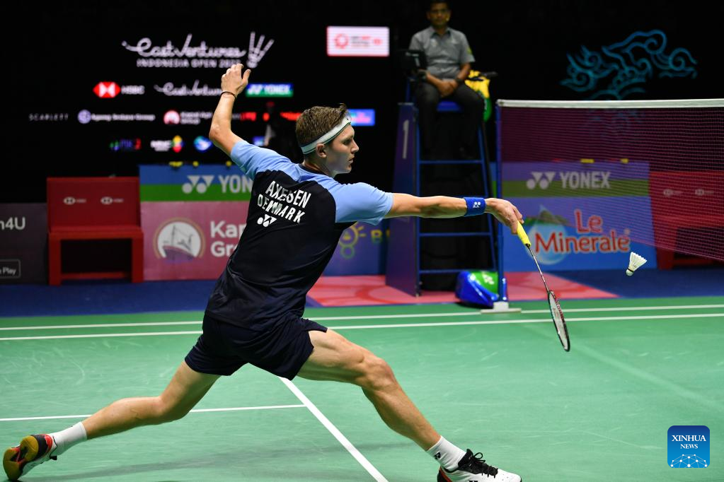 Denmark's Viktor Axelsen hits a return during the men's singles semifinal match against Malaysia's Lee Zii Jia at Indonesia Open 2022 at the Istora Senayan sports stadium in Jakarta, Indonesia, June 18, 2022. (Xinhua/Xu Qin)
