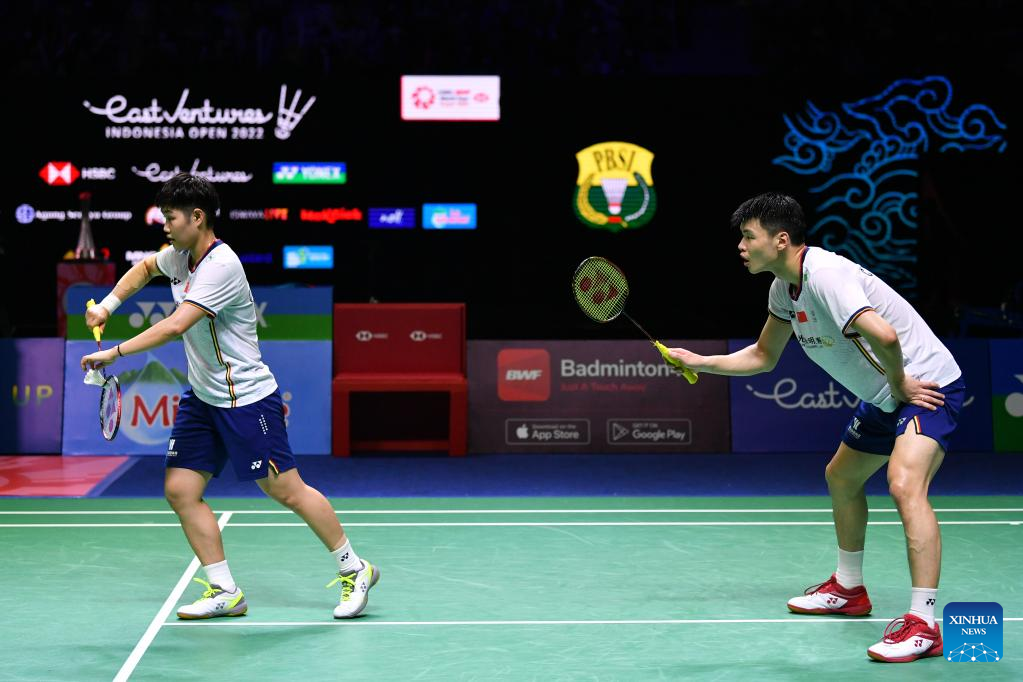 China's Wang Yilyu (R)/Huang Dongping compete during the mixed doubles semifinal match against their compatriots Zheng Siwei/Huang Yaqiong at Indonesia Open 2022 at the Istora Senayan sports stadium in Jakarta, Indonesia, June 18, 2022. (Xinhua/Xu Qin)
