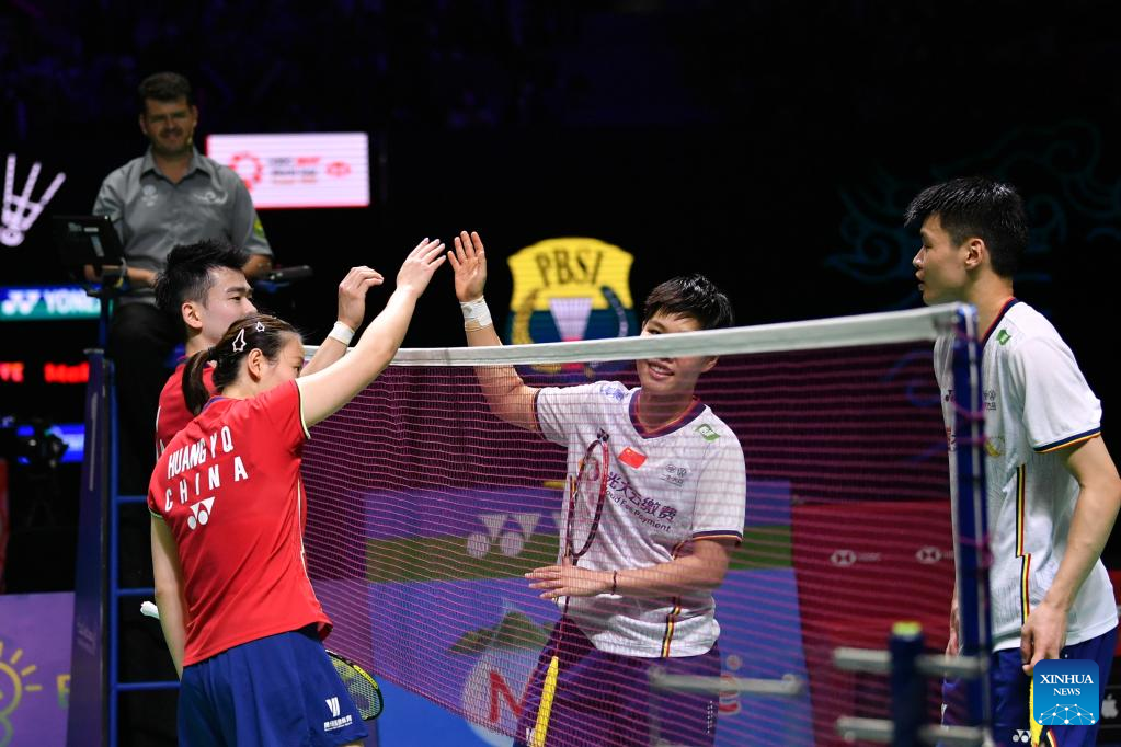 China's Zheng Siwei (1st L)/Huang Yaqiong (2nd L) greet compatriots Wang Yilyu (1st R)/Huang Dongping after their mixed doubles semifinal match at Indonesia Open 2022 at the Istora Senayan sports stadium in Jakarta, Indonesia, June 18, 2022. (Xinhua/Xu Qin)