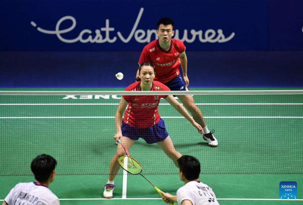 China's Zheng Siwei (rear R)/Huang Yaqiong (rear L) compete during the mixed doubles semifinal match against their compatriots Wang Yilyu/Huang Dongping at Indonesia Open 2022 at the Istora Senayan sports stadium in Jakarta, Indonesia, June 18, 2022. (Xinhua/Xu Qin)