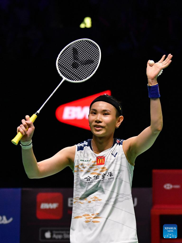 Chinese Taipei's Tai Tzu-Ying celebrates after the women's singles semifinal against China's Chen Yufei at Indonesia Open 2022 at the Istora Senayan sports stadium in Jakarta, Indonesia, June 18, 2022. (Xinhua/Xu Qin)