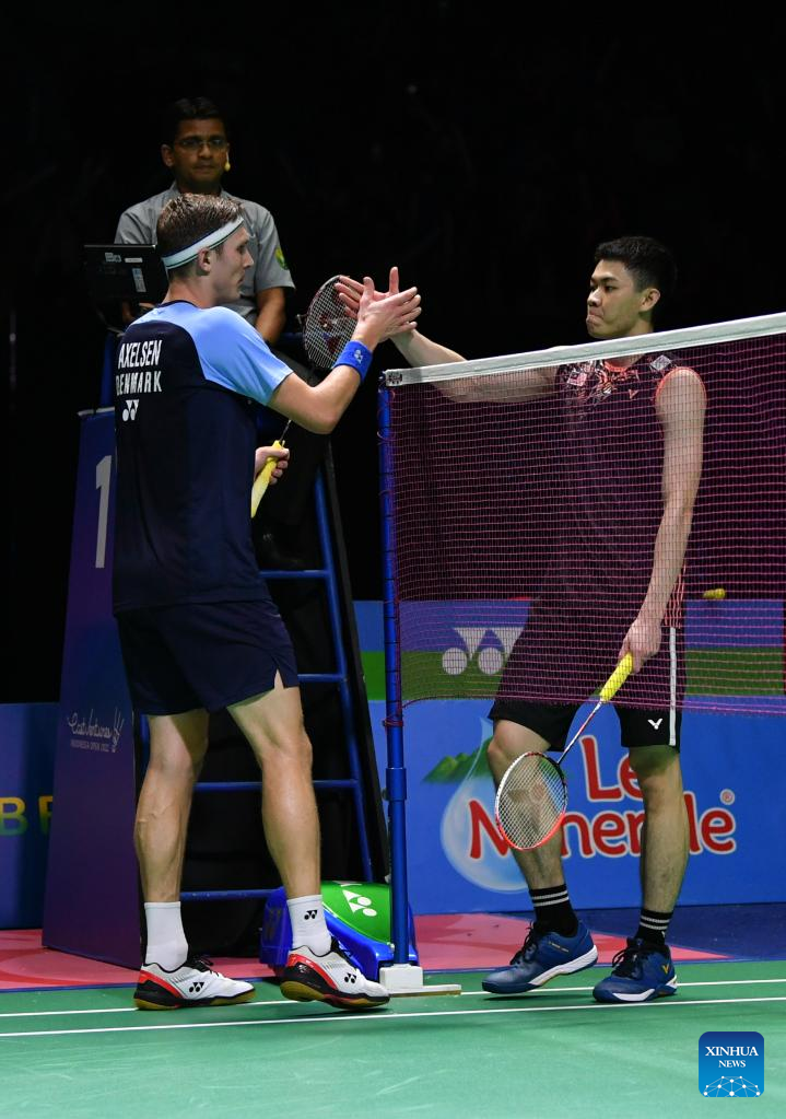 Denmark's Viktor Axelsen (L) shakes hands with Malaysia's Lee Zii Jia(R) after their men's singles semifinal match at Indonesia Open 2022 at the Istora Senayan sports stadium in Jakarta, Indonesia, June 18, 2022. (Xinhua/Xu Qin)