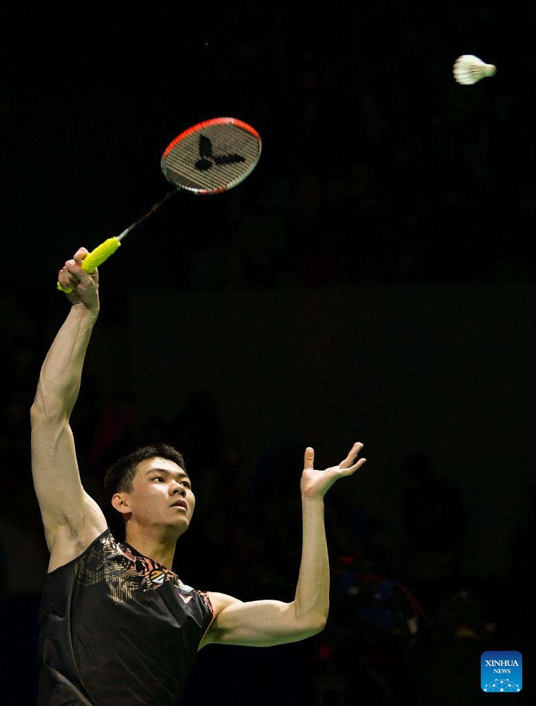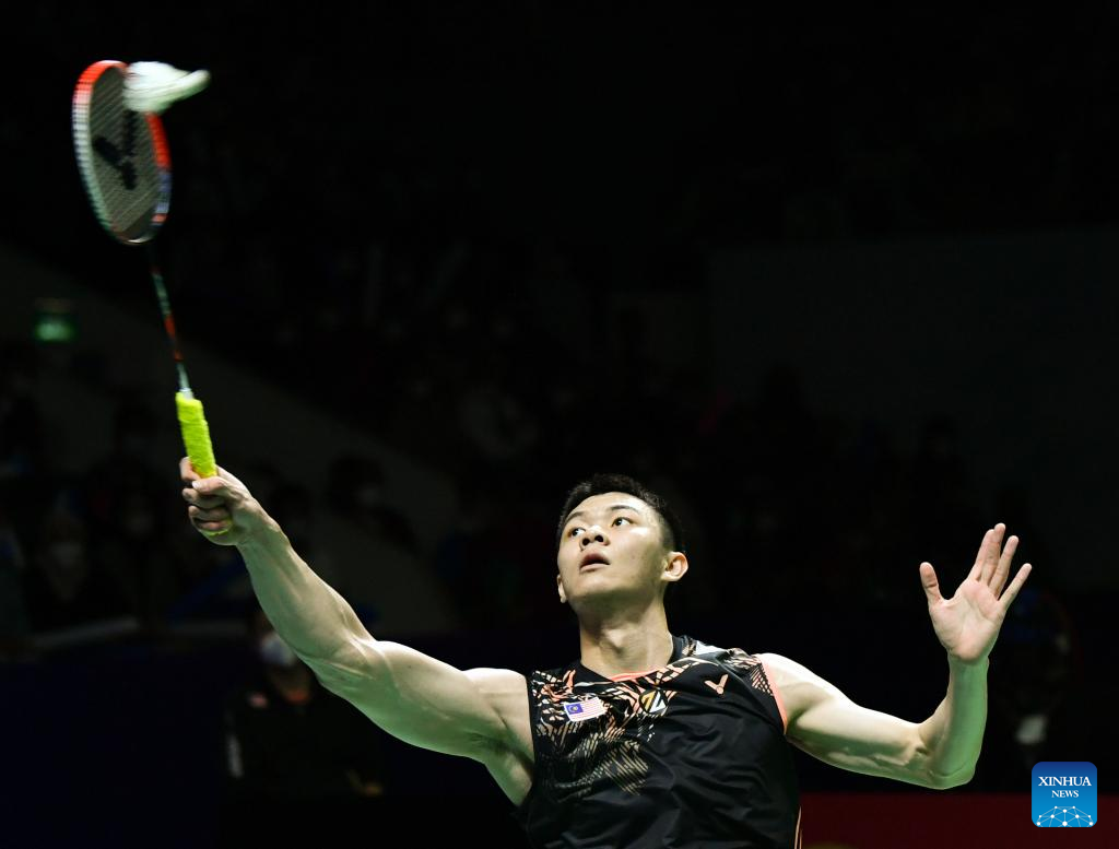 Malaysia's Lee Zii Jia hits a return during the men's singles semifinal match against Denmark's Viktor Axelsen at Indonesia Open 2022 at the Istora Senayan sports stadium in Jakarta, Indonesia, June 18, 2022. (Xinhua/Xu Qin)