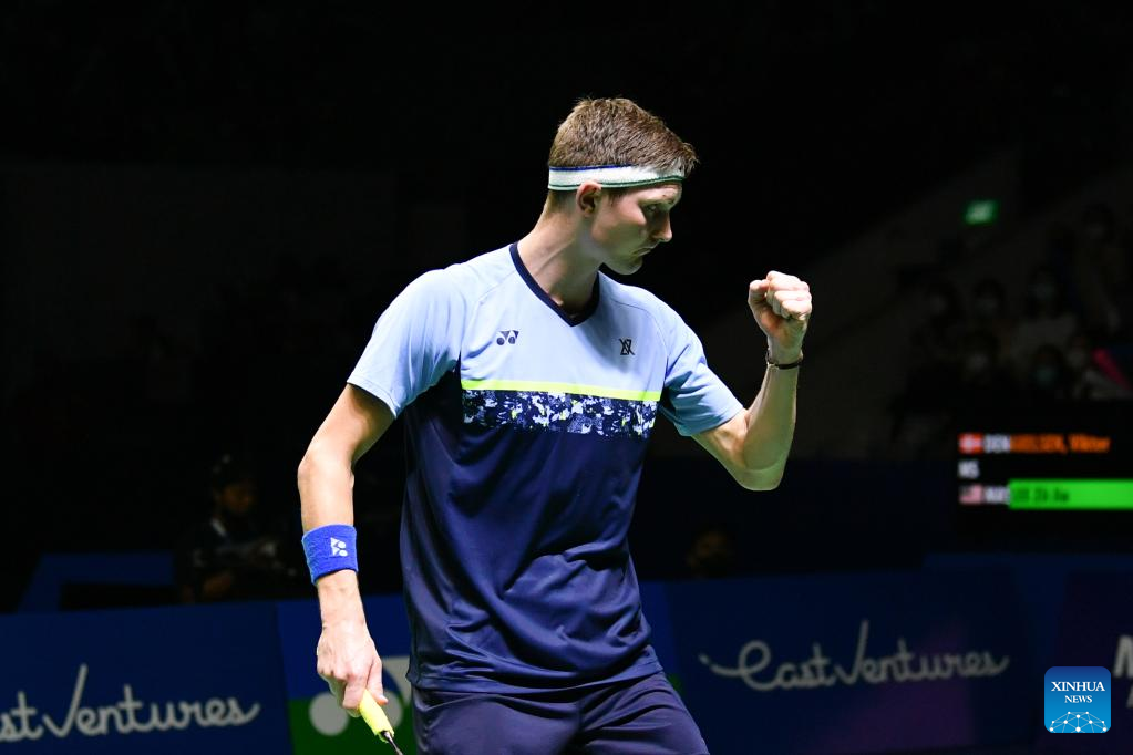 Denmark's Viktor Axelsen reacts during the men's singles semifinal match against Malaysia's Lee Zii Jia at Indonesia Open 2022 at the Istora Senayan sports stadium in Jakarta, Indonesia, June 18, 2022. (Xinhua/Xu Qin)