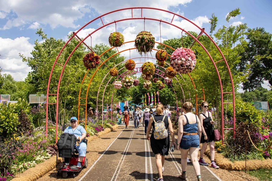 People visit the Philadelphia Flower Show in Philadelphia, the United States, June 17, 2022. (Photo by Winston Zhou/Xinhua)