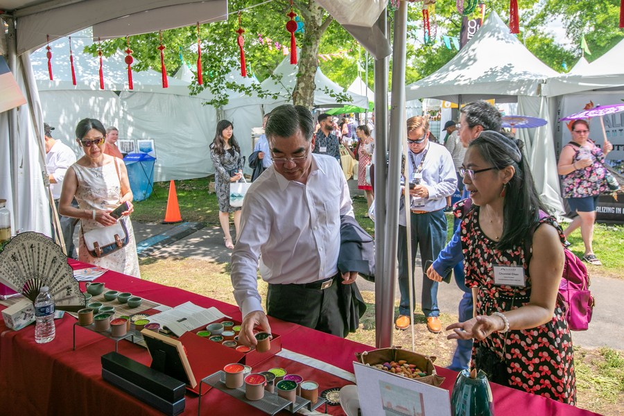 Chinese Consul General in New York Huang Ping (C) visits a China Day event of the ongoing Philadelphia Flower Show in Philadelphia, the United States, June 17, 2022. (Photo by Winston Zhou/Xinhua)