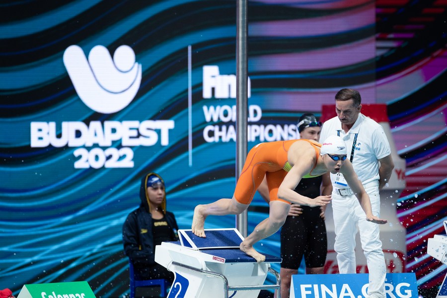 Zhu Menghui of China competes during the women's 4X100m freestyle relay final at the 19th FINA World Championships in Budapest, Hungary on June 18, 2022. (Xinhua/Meng Dingbo)