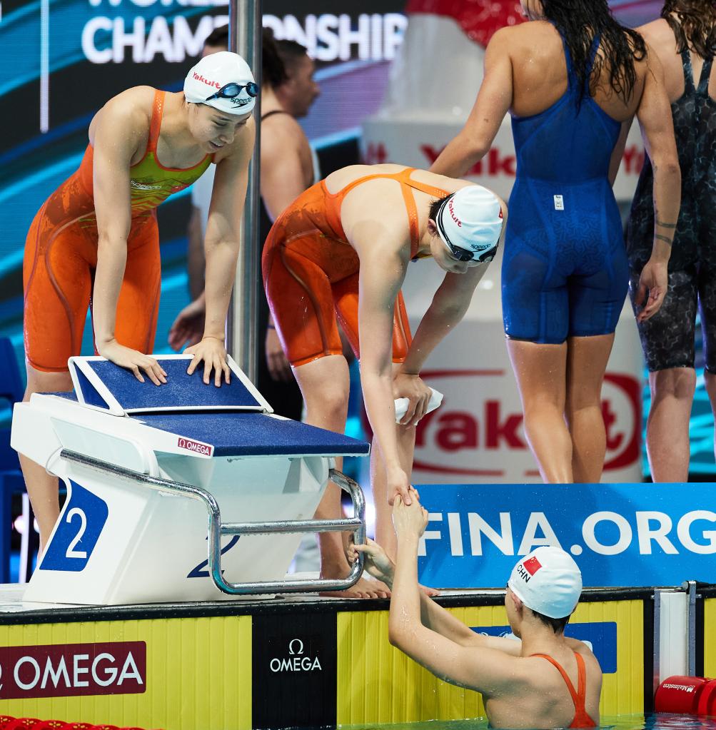 Zhu Menghui, Yang Junxuan and Cheng Yujie (from L to R) of China react after the women's 4X100m freestyle relay final at the 19th FINA World Championships in Budapest, Hungary on June 18, 2022. (Xinhua/Meng Dingbo)
