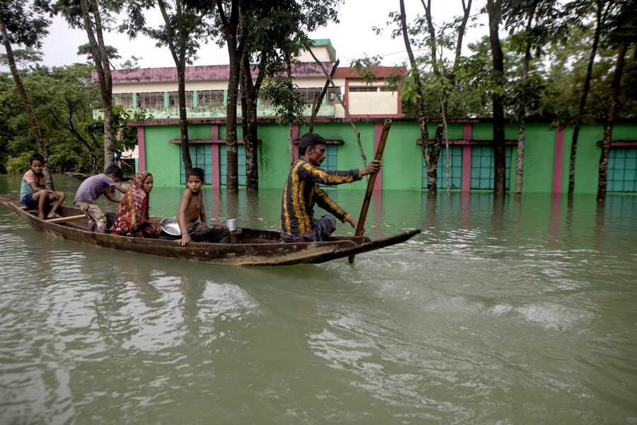 People move by boat from a flood-affected area to a safe place in Sylhet, Bangladesh, on June 19, 2022. (Xinhua)